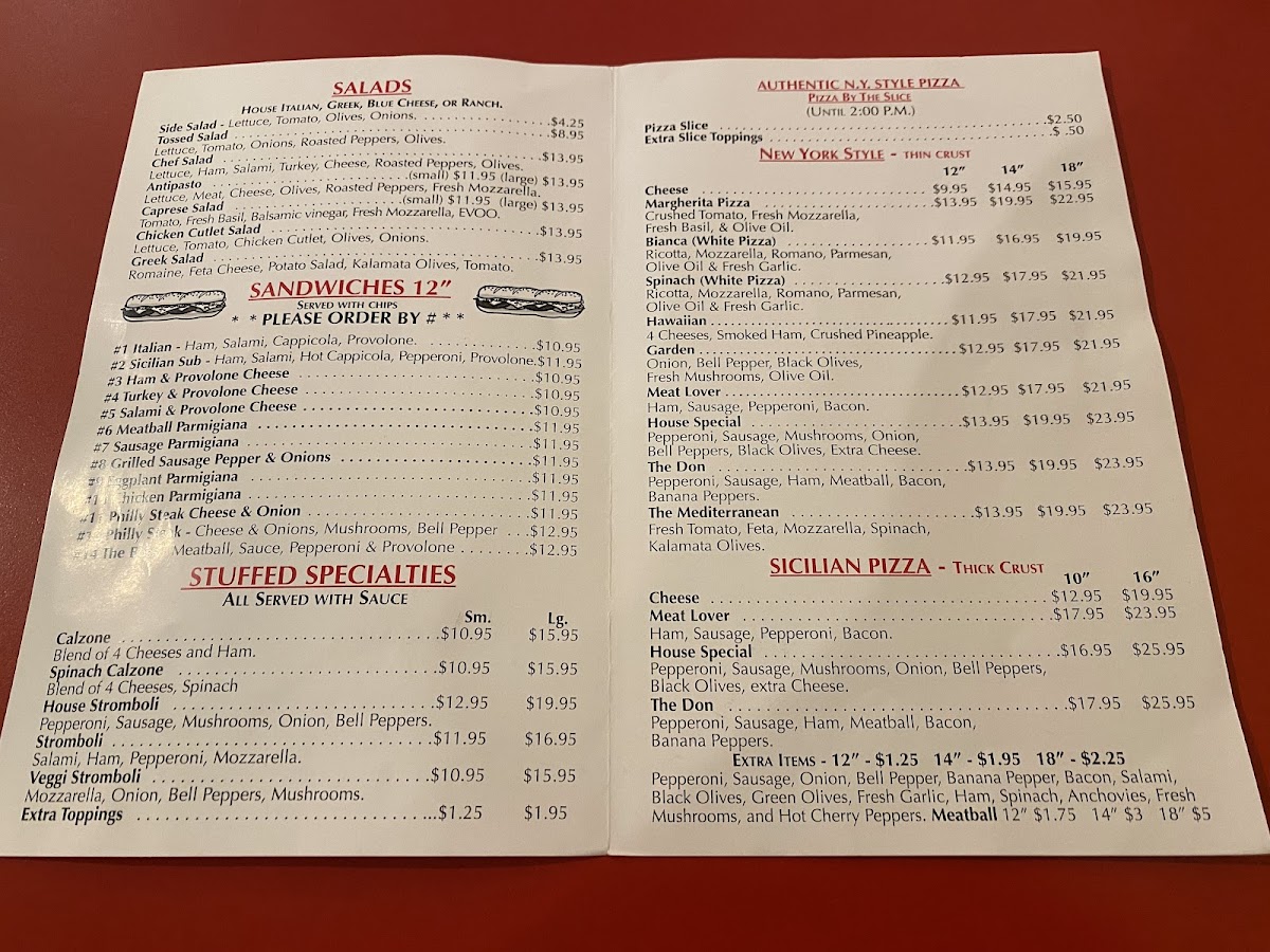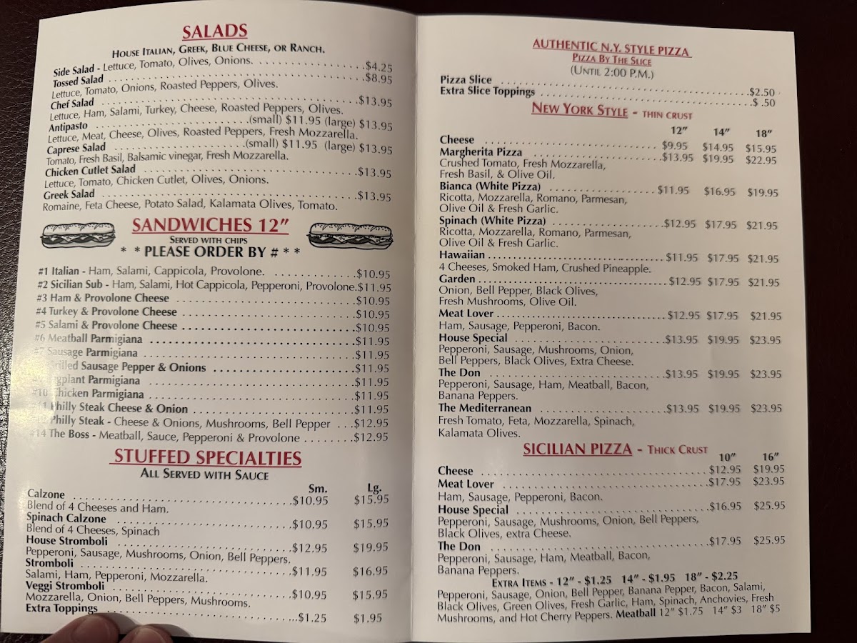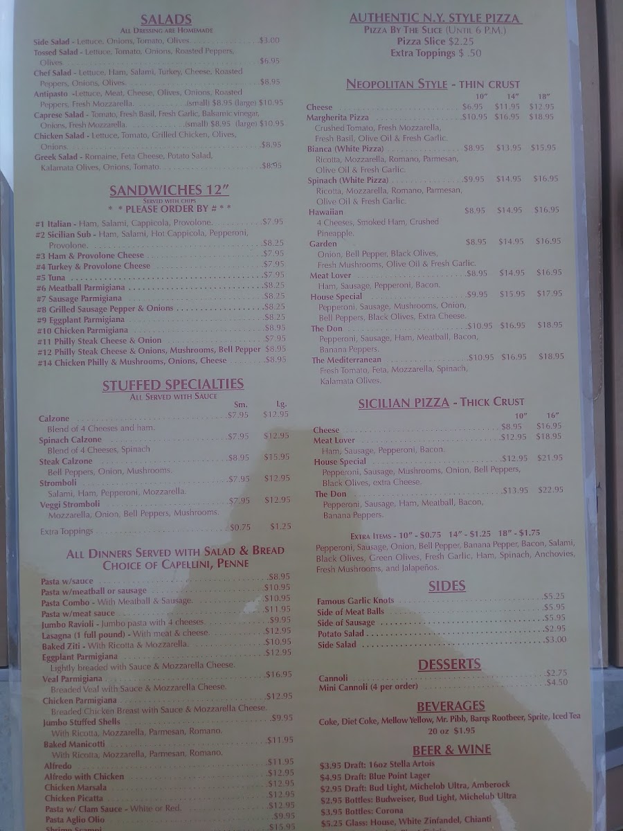 Guests can expect a range of options from flavorful pizzas like White Pizza or the hearty Meatball Parmigiana to fresh salads such as Antipasto or Caprese Salad. The menu also features satisfying sandwiches and traditional pasta dishes, making it a versatile choice any time of day. Freshly made garlic knots and generous calzones provide great bites to share or enjoy alongside your main order.