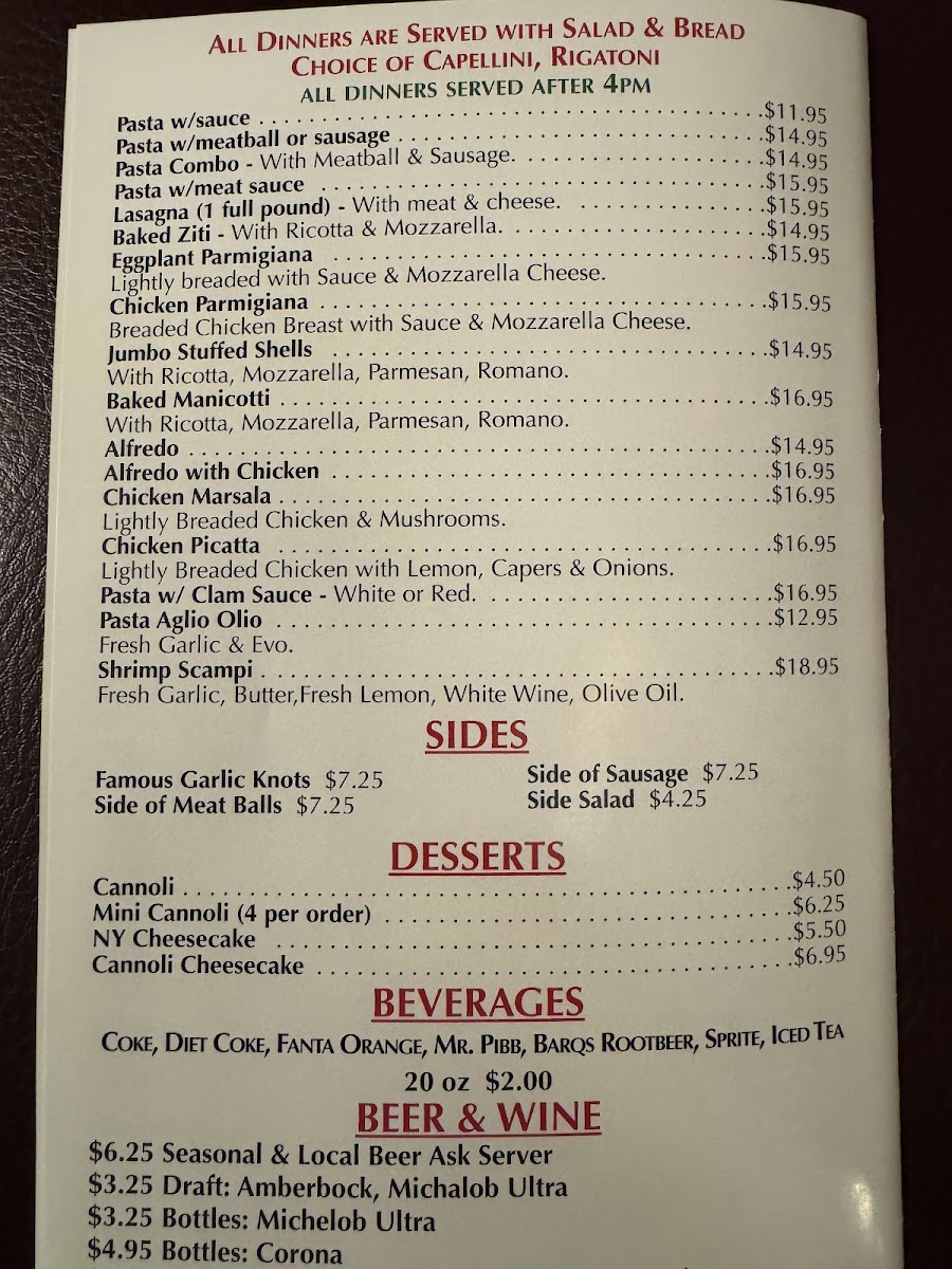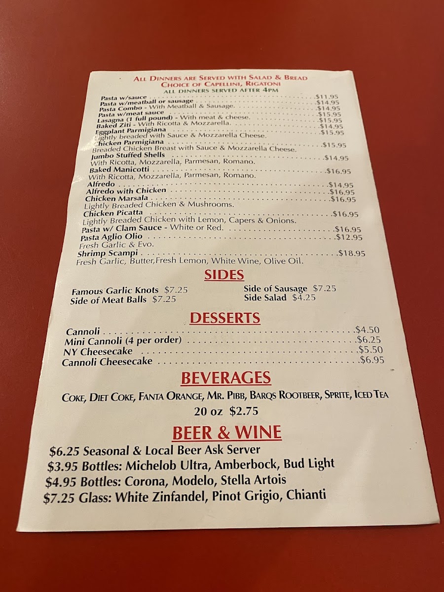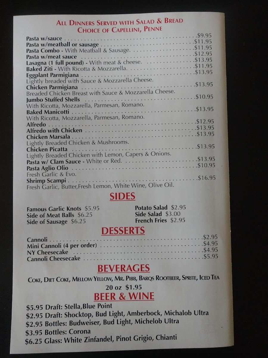 Guests can expect a range of options from flavorful pizzas like White Pizza or the hearty Meatball Parmigiana to fresh salads such as Antipasto or Caprese Salad. The menu also features satisfying sandwiches and traditional pasta dishes, making it a versatile choice any time of day. Freshly made garlic knots and generous calzones provide great bites to share or enjoy alongside your main order.