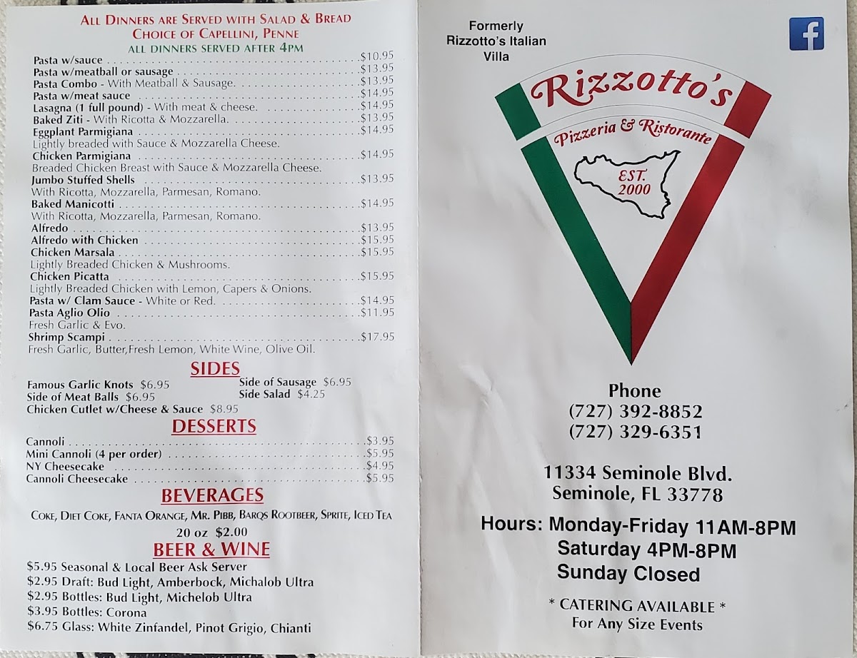 Rizzotto's Pizzeria offers a straightforward, comforting menu centered on classic Italian favorites and well-loved pizza selections. The atmosphere invites casual dining, whether you're stopping in for a quick slice or settling in for a more relaxed meal with family and friends. The menu strikes a balance between familiar staples and hearty comfort dishes, creating a welcoming spot for everyday meals and casual gatherings.